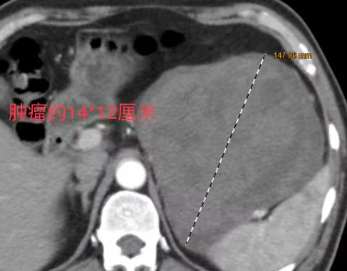 患者病情初步稳定后,查明出血根源成为彻底治愈的关键。进一步检查证实,此次险情的“元凶”是一枚直径约15cm的胃巨大肿瘤——该肿瘤包绕脾脏血管、压迫胰腺,如何在手术中保留脾脏和胰腺是一大难题,手术难度系数极高。