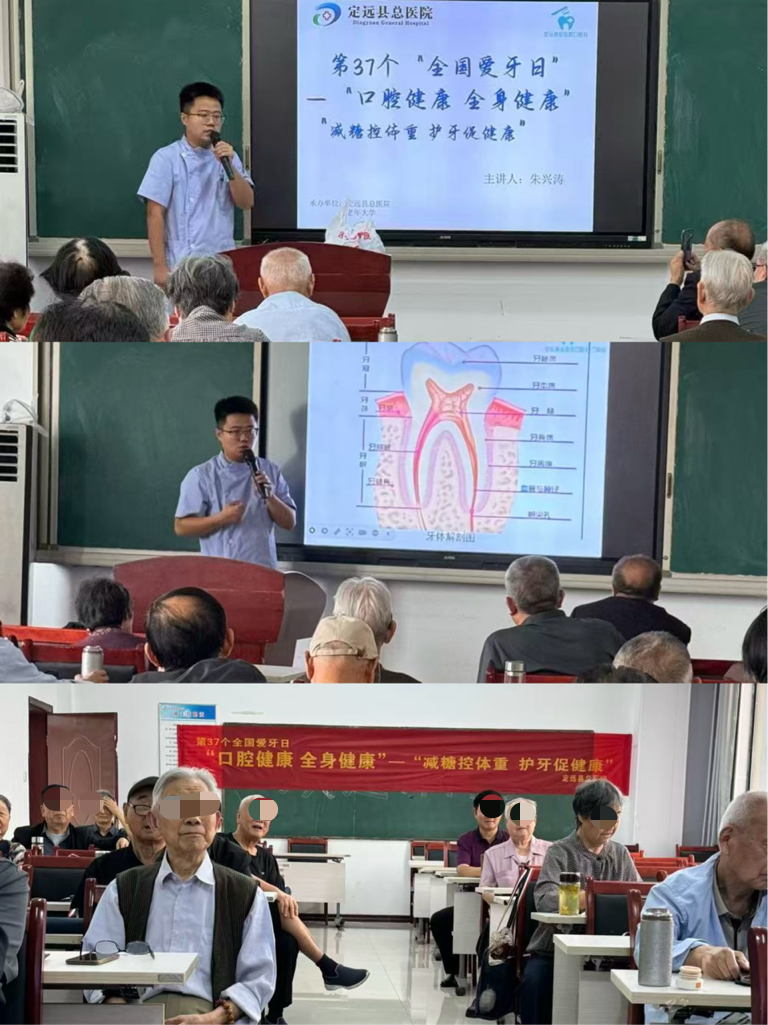 同日,口腔科主治医师朱兴涛与执业医师陆江山前往定远县老年大学,紧扣爱牙日“关爱老年人口腔健康”主题开展科普服务。朱兴涛医师围绕“老年人口腔疾病与全身健康的关联”展开讲解,重点介绍了义齿护理、牙周病防治及缺牙修复的重要性,破除“人老掉牙是正常现象”的误区;陆江山医师为现场老年人提供免费口腔检查,耐心解答镶牙、补牙等常见问题,指导老年人通过科学护理延缓口腔功能衰退,助力老年群体拥有健康口腔、享受幸福晚年。